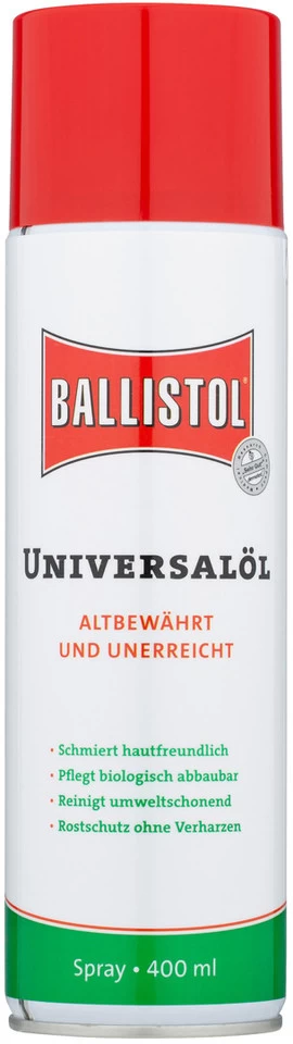 Mentions :Ballistol est absolument doux pour la peau et a été testé par Dermatest avec le résultat « très bon ».Le magazine « selbst ist der Mann » parle dans le numéro 7 / juillet 2013 de l’huile universelle Ballistol. « selbst ausprobiert » lui octroie 5 de 5 marteaux.Caractéristiques :soigne, lubrifie, désinfecte, protège contre la rouillese glisse dans les interstices les plus étroitsne se résinifie pas, est entièrement biodégradablede qualité alimentaire, n’irrite pas la peau et totalement inoffensivele tuyau pour les bricoleurs, l’industrie et le commercenettoie les chaînes, les fourches à suspension et les câbles Bowdenidéal pour l’hivernage et la restaurationidéal pour nettoyer et entretenir les fourches à suspension Fox et RockShoxNuméros du fabricant :50 ml:21450200 ml:21700400 ml:21810Contenu :1 x spray d’huile universelle Ballistol