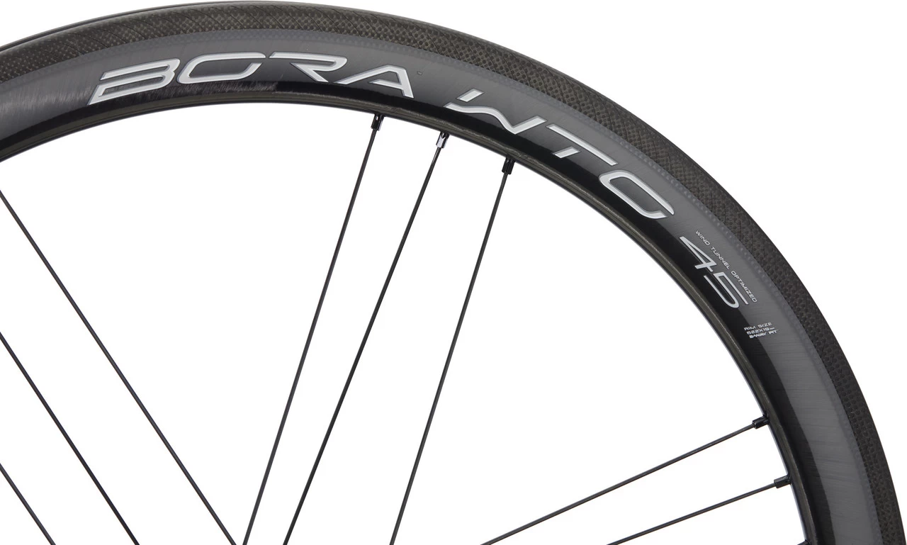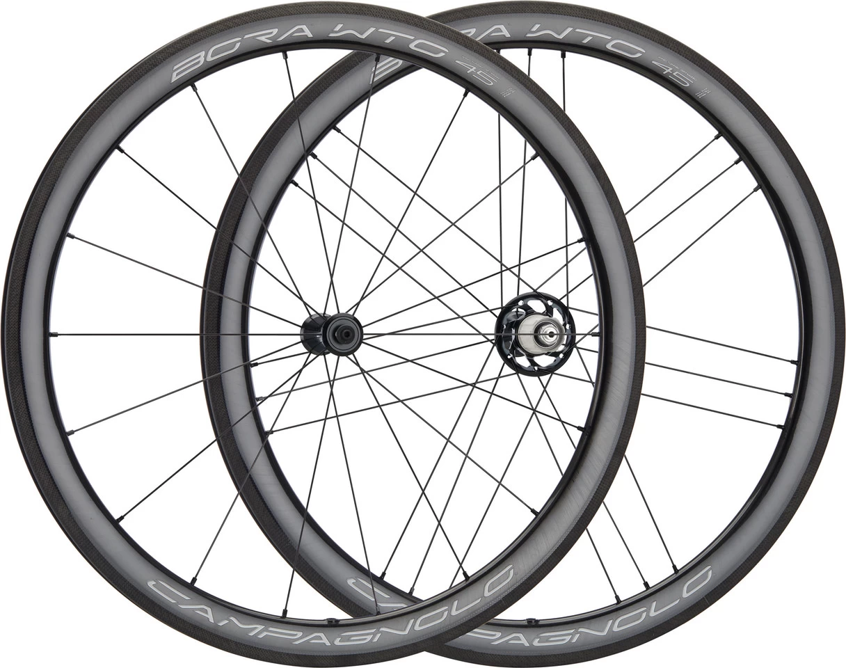 La paire de roues Bora WTO 28″ en carbone de Campagnolo a une hauteur de jante de 45 mm et convient aux vélos de route avec freins sur jante qui sont également utilisés en compétition.