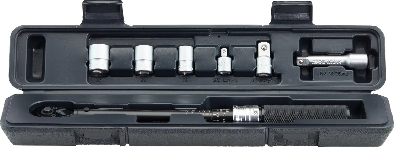1 x clef dynamométrique 3min19sec Premium 10 – 60 Nm1 x extension de 75 mm pour 3/8″1 x adaptateur 3/8″ en 1/2″1 x adaptateur 3/8″ en 1/4″1 x douille 13 mm1 x douille 15 mm1 x douille 17 mm1 x boîtier de rangement