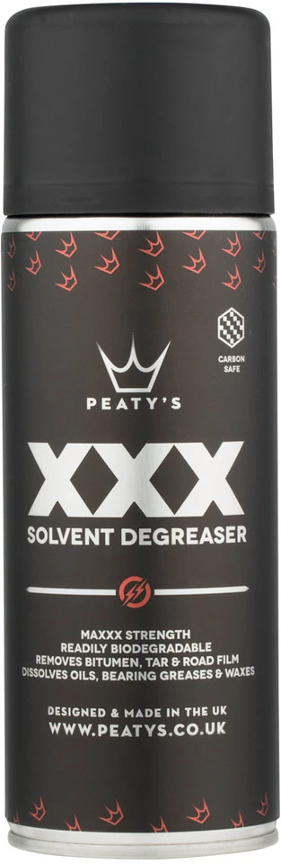 Peaty’s XXX Solvent Degreaser est un solvant dégraissant et déparaffinant puissant, soluble dans l’eau et biodégradable pour l’élimination complète de la graisse de roulement, des cire, d’huile et des taches de bitume et de goudron. Il peut être utilisé sur des surfaces métalliques, mais aussi sur du carbone et de nombreux autres plastiques et surfaces vernies.