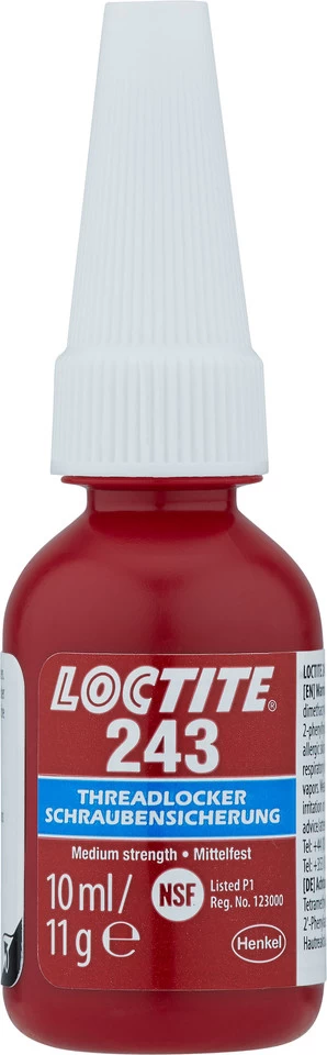 Loctite 243 est un arrêt de filetage de résistance moyenne, d’application universelle. Ce produit protège les vis, les écrous et les goujons contre le desserrage dû aux vibrations et garantit en même temps l’étanchéité. Il convient pour tous les métaux, y compris les matériaux passifs tels que l’acier inoxydable, l’aluminium et les surfaces galvanisées. Elle a prouvé sa tolérance à de faibles niveaux de contamination par des huiles industrielles, par exemple des huiles de moteur, des huiles anticorrosion et des huiles de coupe.