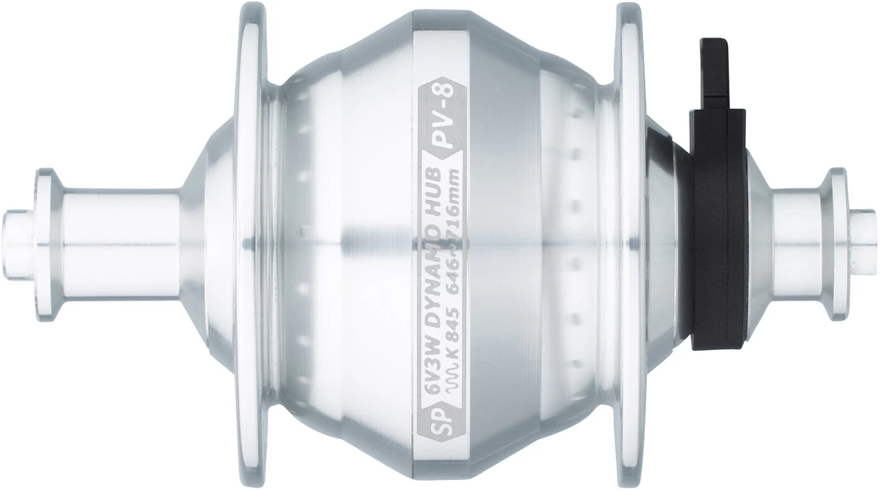 Les dynamos de la série P sont non seulement puissantes mais aussi efficaces, offrant un rendement inégalé de 72 % à 15 km/h. Le boîtier du moyeu du PV-8 semble minimaliste, l’effort de conception à l’intérieur est exactement le contraire. Une grande attention a été portée à chaque détail, aussi petit soit-il, pour obtenir un résultat parfait. Le corps ovale lisse du moyeu offre un équilibre idéal entre faible poids et résistance exceptionnelle. Un grand choix de couleurs et différents nombres de trous permettent de trouver la dynamo de moyeu assortie pour chaque vélo.
