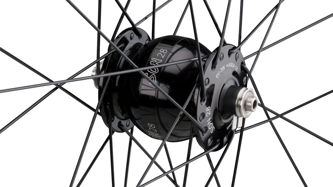 Le cour d’une roue avant solide : le moyeu à dynamo Son 28 dans la roue avec la jante Mavic A Open Pro UST