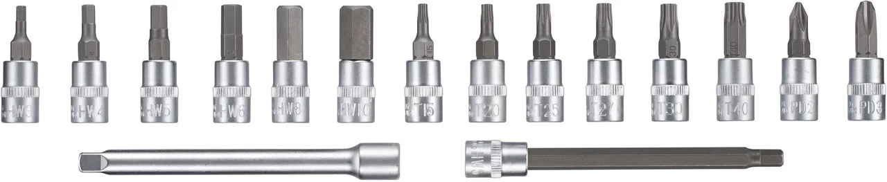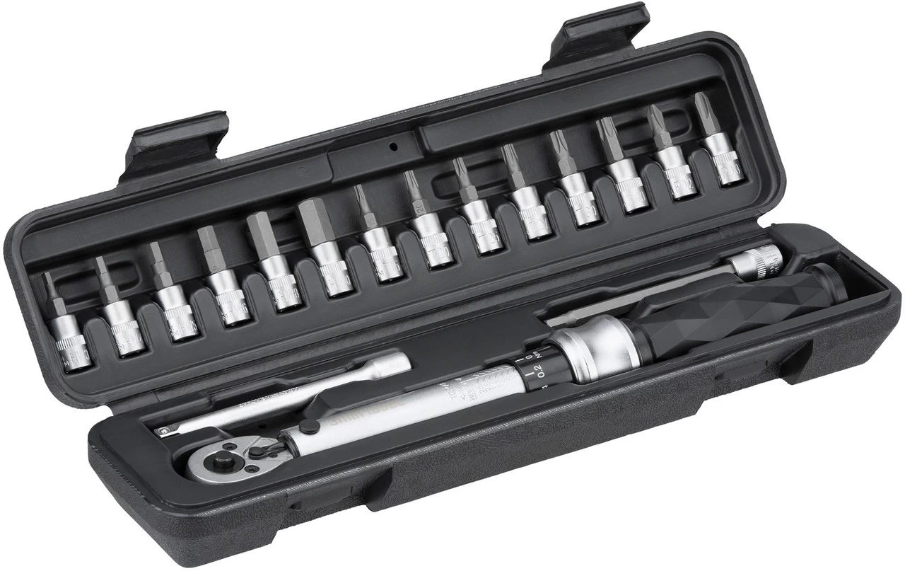 1 x clef dynamométrique 3min19sec6 x embouts hexagonaux1 x embout hexagonal extra long6 x embouts Torx2 x embouts cruciformes2 x clefs à douille1 x rallonge1 x boîte de rangement