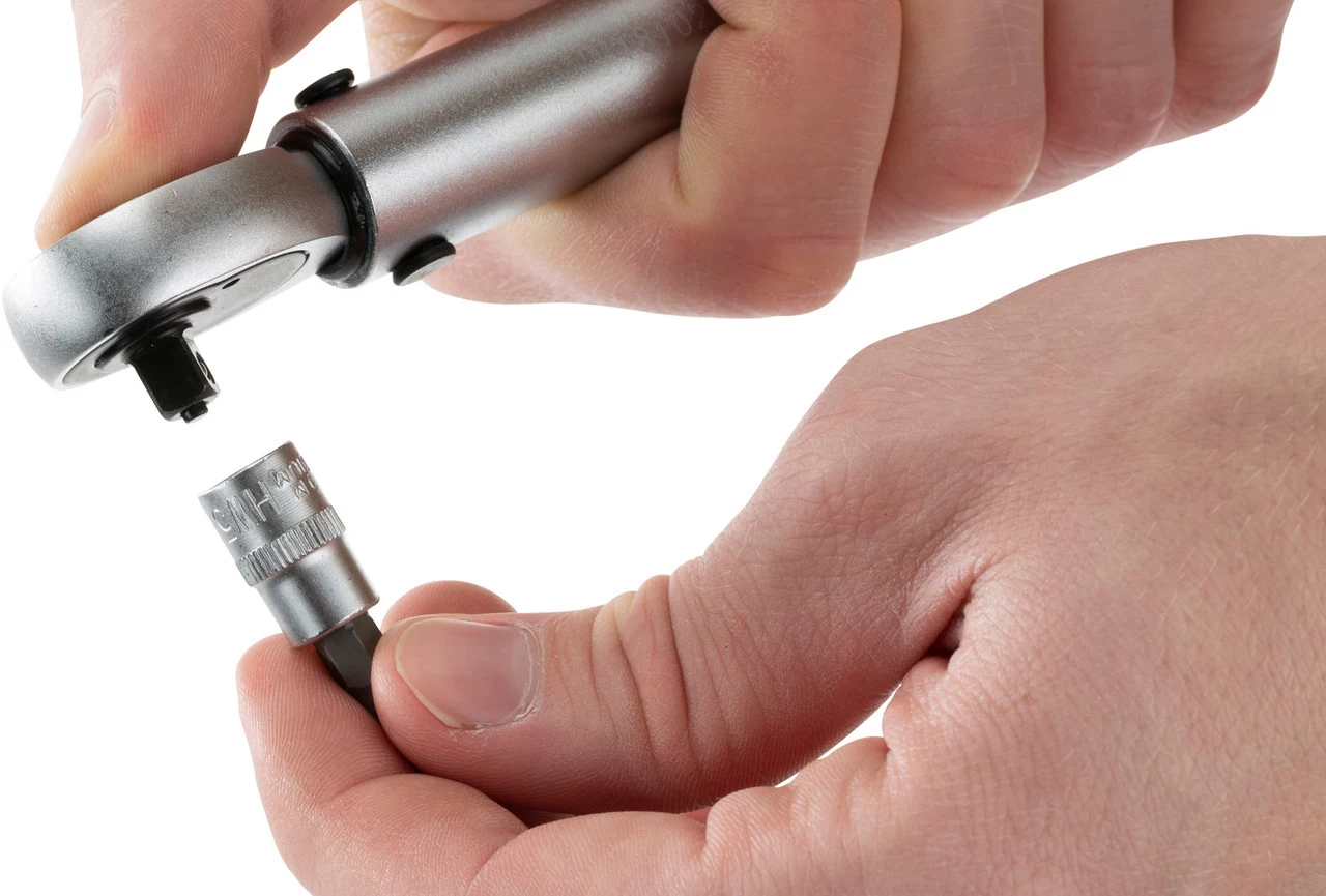 Le « craquement » lorsque le couple de serrage est atteint peut être très silencieux. Reste donc vigilant et garde un oeil sur le course à vide dans la tête de l’outil. Une fois que le couple défini est dépassé, des couples plus élevés sont transmis et risquent d’endommager ton vélo.