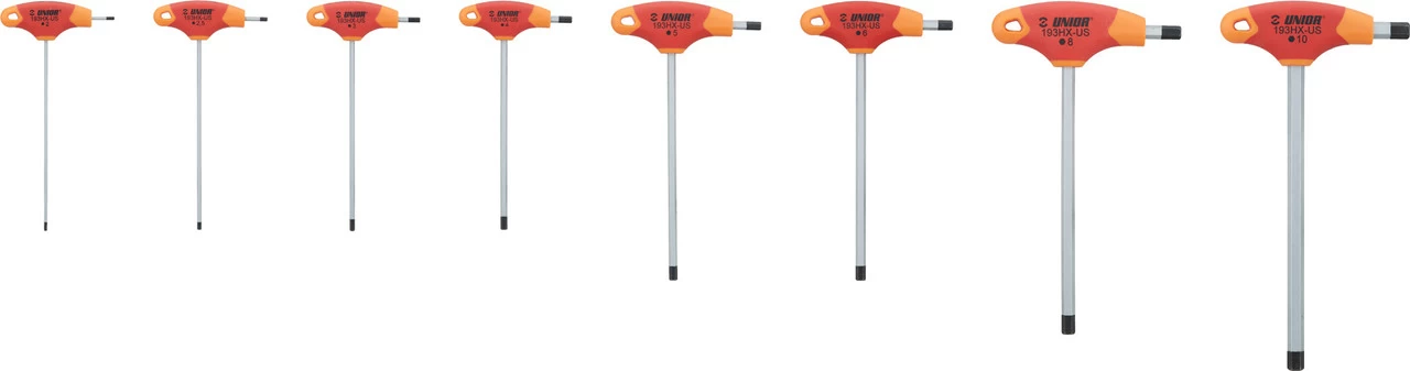 Contenu :1 x set de clefs hexagonales Unior Bike Tools 193HX avec poignée en T, 8 pièces