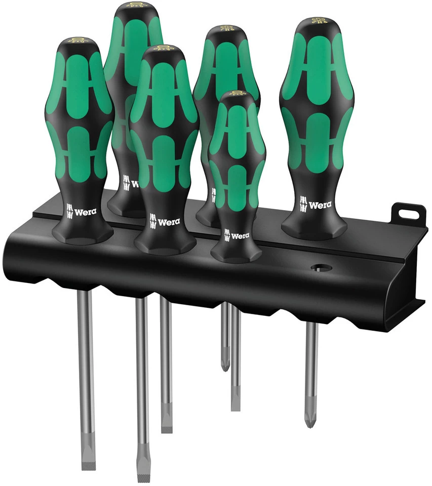 Spécifications :Utilisation:vis fendues et vis cruciformes Phillips-RecessType:6 pièces + supportCaractéristiques :Poignée moulée multi-composants pour un travail rapide et en douceurLes matériaux durs utilisés pour le manche permettent de rapidement repositionner ses mains sans risque que la peau ne « colle » au manche. Les zones dures circonférentielles ayant le plus grand diamètre roulent comme des roues dans la main.Le Lasertip Wera se fixe dans la tête de la vis pour empêcher le dérapage hors de la tête de la visÉtiquetage des poignées avec le symbole de la vis et la taille de la poignée pour un repérage plus facile dans le sac à outils et sur le lieu de travailLa forme hexagonale empêche l’outil de constamment rouler sur le plan de travailTechnologies :Kraftform – La forme pensée par la main